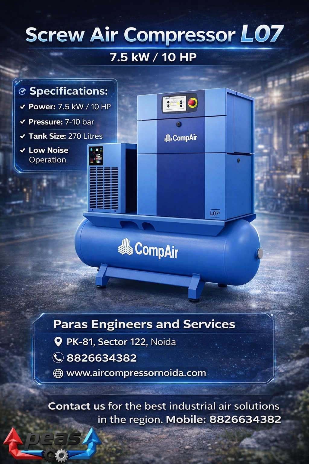CompAir C55-14 -C76 Volume Flow 5.5 to 7.6m3/min & Operating Pressure 7 to 14 bar This new range of compressors stands out for its low diesel consumption, which is 10% less than the previous range. Equipped with a Diesel Particle Filter, these modern compressors are built to the latest emission standard Stage V. Thanks to a wide pressure range up to 14 bar, this compact compressor range is extremely versatile and meets the requirements of numerous applications.